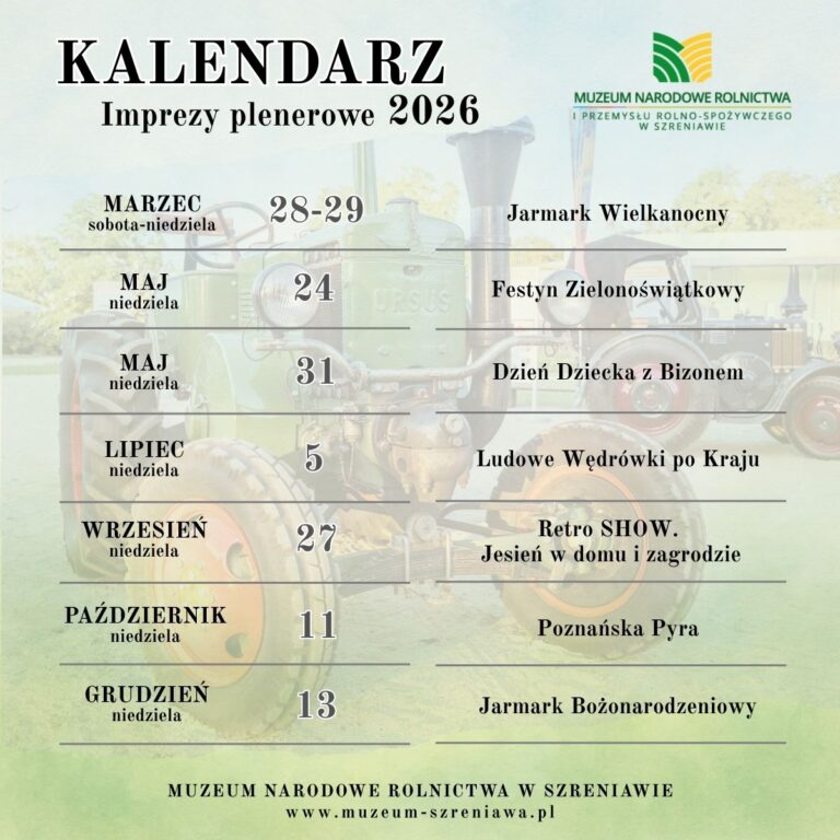 Muzeum Narodowe Rolnictwa i Przemysłu Rolno-Spożywczego w Szreniawie serdecznie zaprasza na imprezy rekreacyjno-edukacyjne, które organizujemy przez cały rok! To wyjątkowe okazje, aby w ciekawy i angażujący sposób poznać historię rolnictwa i dawnych tradycji. Przygotowaliśmy dla Was pełne atrakcji programy, które pozwolą odkryć tajniki rolnictwa, rzemiosła i życia na wsi.